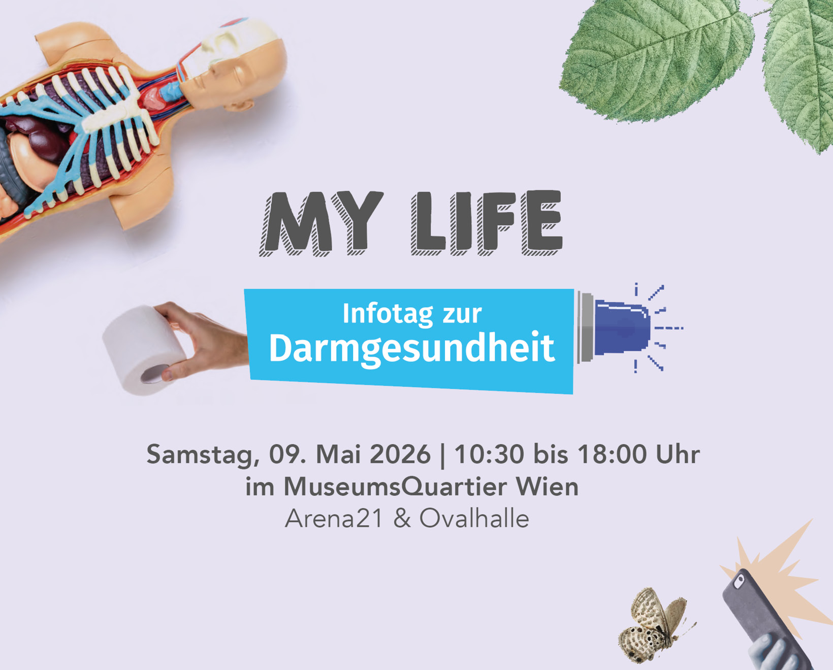 Die MY LIFE Infotage zur Darmgesundheit gehen heuer in die nächste Runde. Der Auftakt findet am Samstag, 9. Mai 2026 im Wiener Museumsquartier statt. Neben medizinischen Fachvorträge erwarten Sie etwa auch ein begehbares Darmmodell, eine VR-Darmreise, die Möglichkeit zum kostenlosen Bauchultraschall vor Ort, Selbsthilfe und Gesundheitsservices, #makeitvisible Ausstellung und Show Cooking.